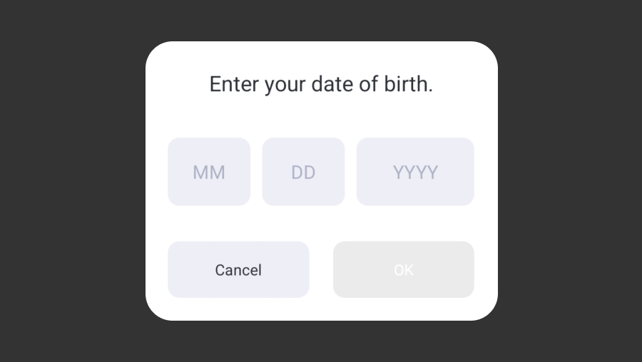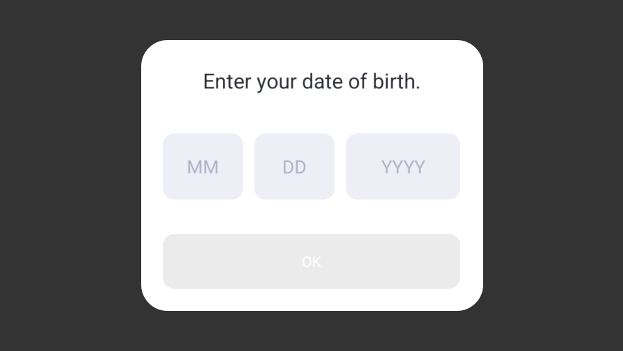 AuthV4.checkAgeGate 向使用者顯示可以輸入出生日期資訊的彈出視窗。使用者可以在彈出視窗的年/月/日項目中選擇自己的出生日期。當使用者完成輸入後,AuthV4.checkAgeGate 會將該值(yyyy-MM-dd 格式)作為回調返回。