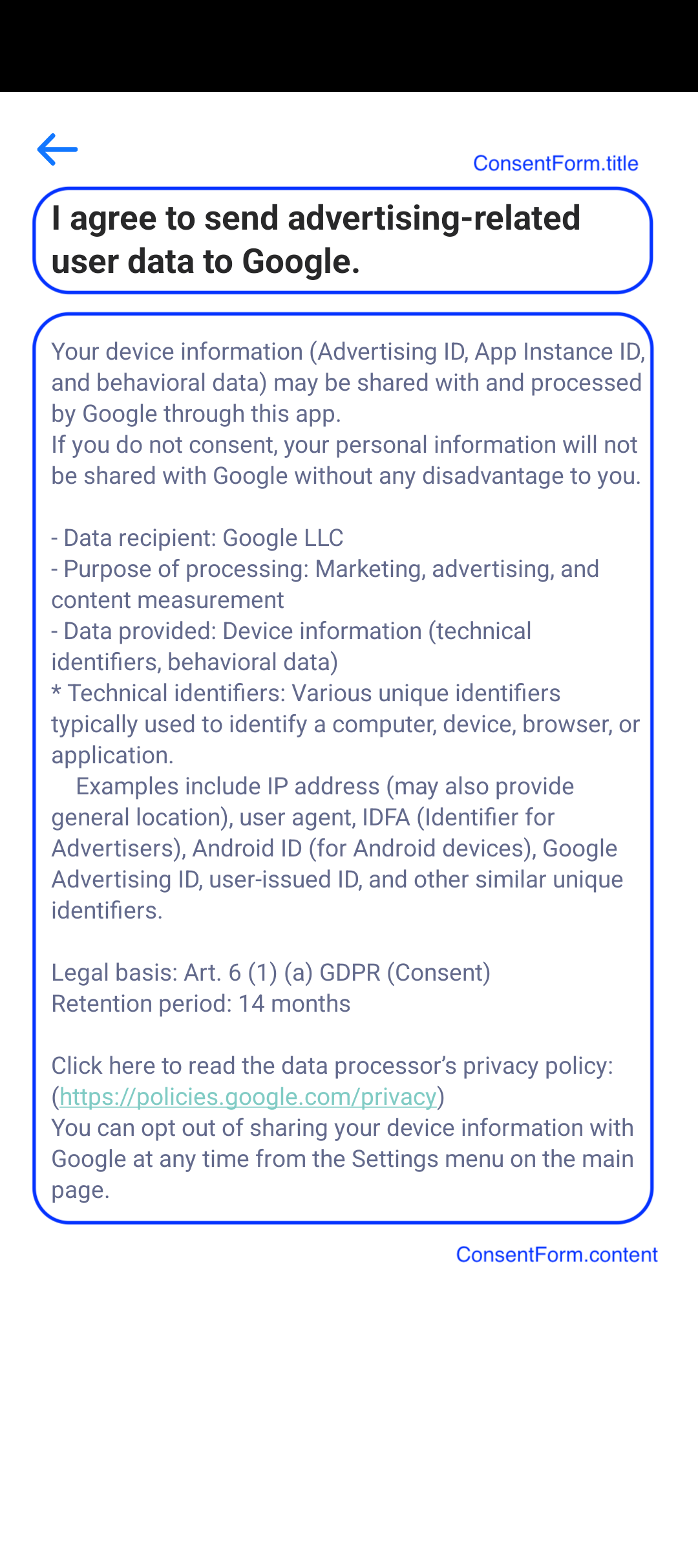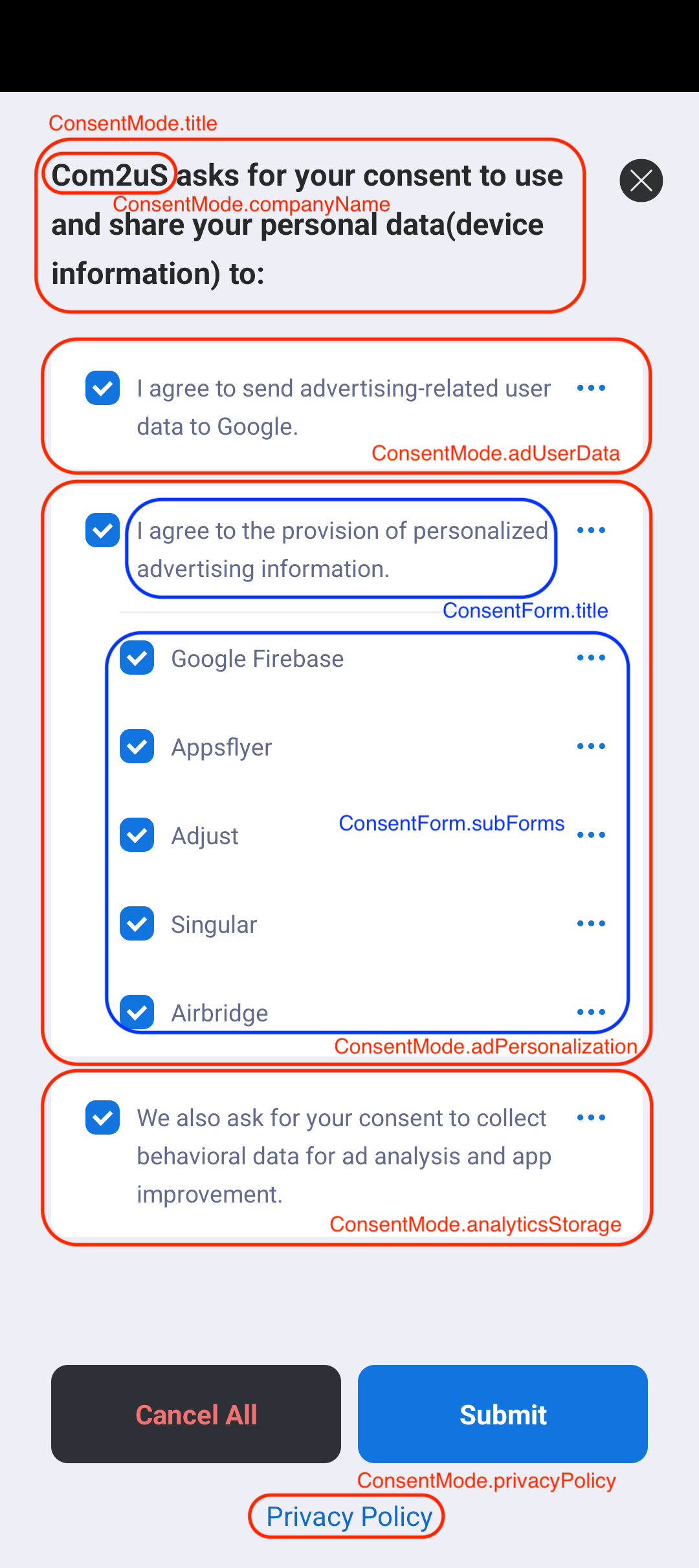ConsentMode.title: 顯示在同意橫幅頂部的文本。ConsentMode.companyName: 在顯示基本信息時,必須提供公司名稱,並在同意表單的標題和內容中設置。ConsentMode.privacyPolicy: 當按下同意橫幅底部的「隱私政策」按鈕時運行的 URL。ConsentMode.adUserData: 用於廣告用戶數據使用的同意項目 (ad_user_data)。ConsentMode.adPersonalization: 用於個性化廣告使用的同意項目 (ad_personalized)。ConsentMode.analyticsStorage: 用於分析和統計數據收集的同意項目 (analytics_storage)。 (目前僅支持「Google」)ConsentForm.id: 同意項目的唯一標識符。可以包括目的 (ad_user_data, ad_personalization, analytics_storage) 以及每個 MMP 廠商的個性化廣告目的 ("google", "adjust", "appsflyer", "singular", "airbridge")。ConsentForm.title: 同意項目的標題文本。ConsentForm.content: 同意項目的描述文本。ConsentStatus.id: 同意項目的唯一標識符。參考 ConsentForm.id 內容。ConsentStatus.granted: 同意項目的同意狀態值。當同意時為 Analytics.CONSENT_GRANTED,當拒絕時為 Analytics.CONSENT_DENIED。