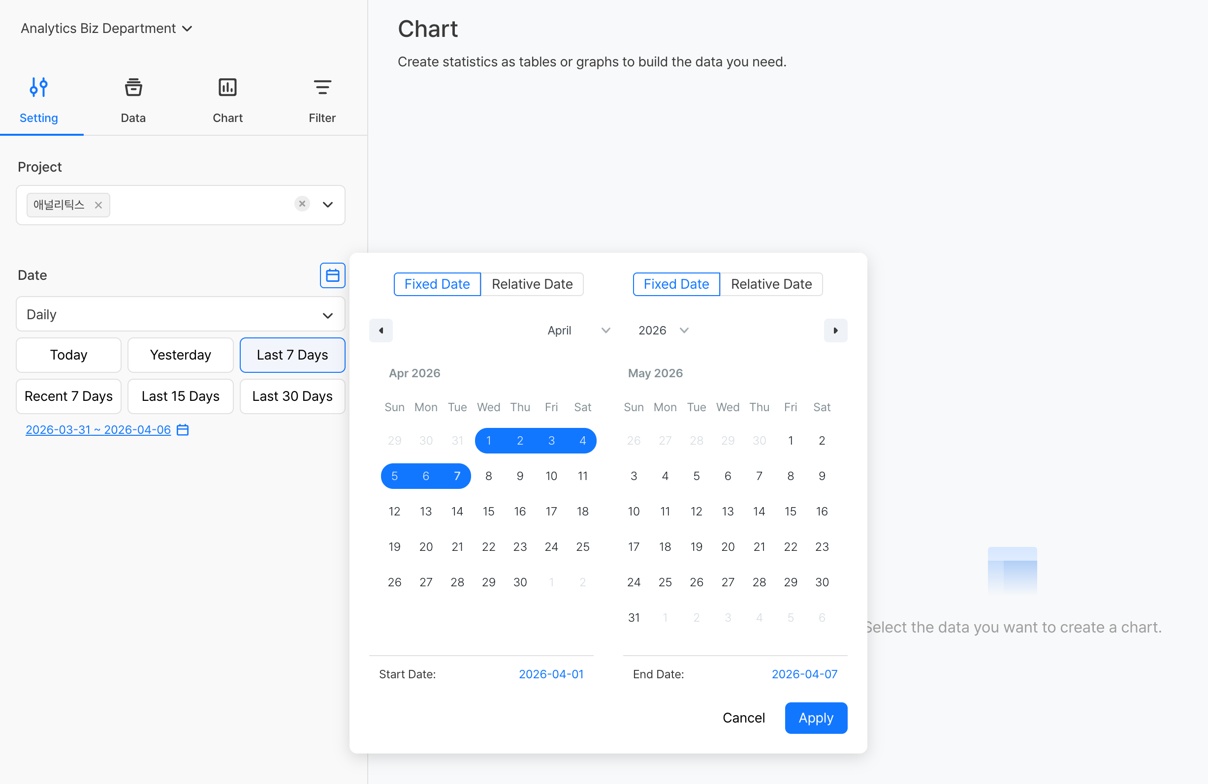- 在 [設定] 分頁中設定分析專案與期間(日/週/月/時/分單位)、日期範圍。