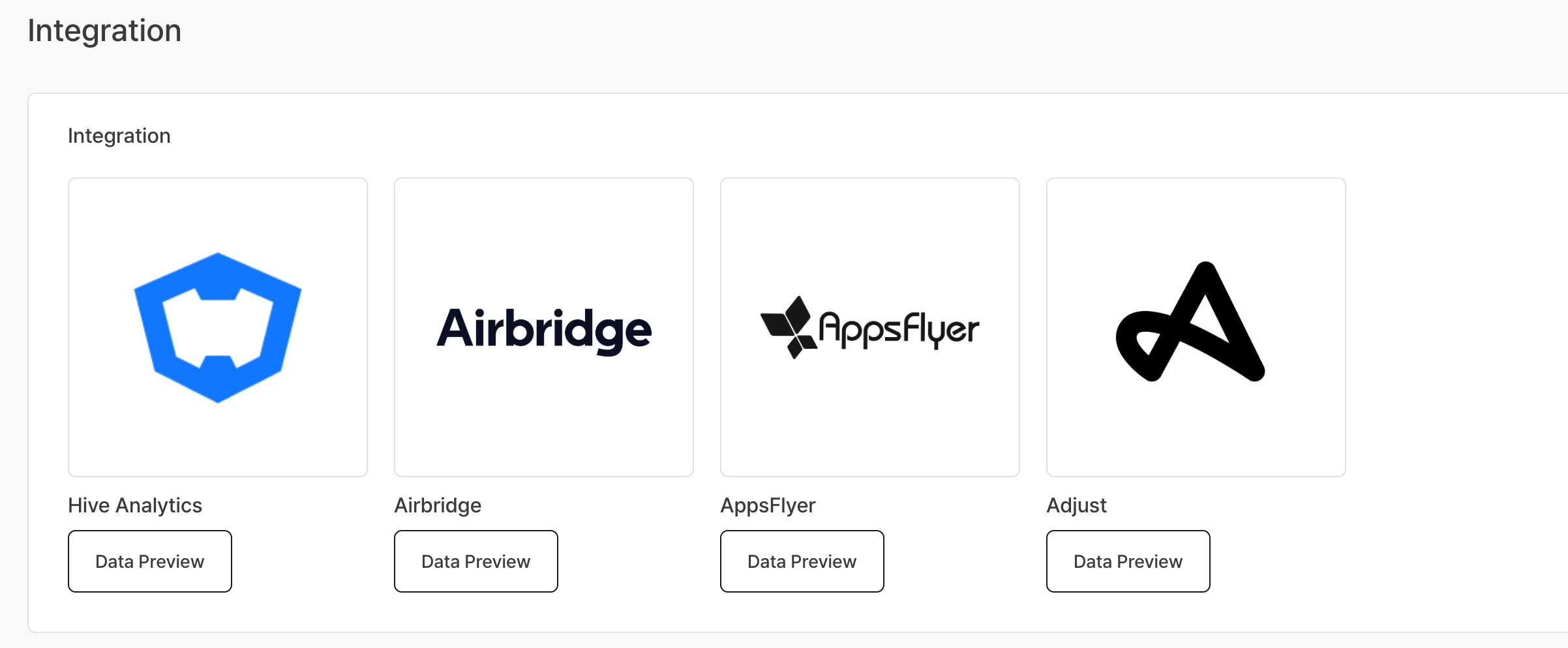 - Airbridge:點擊卡片時,會以新視窗顯示 Hive 控制台 > 行銷歸因 > Airbridge 設定頁面。
