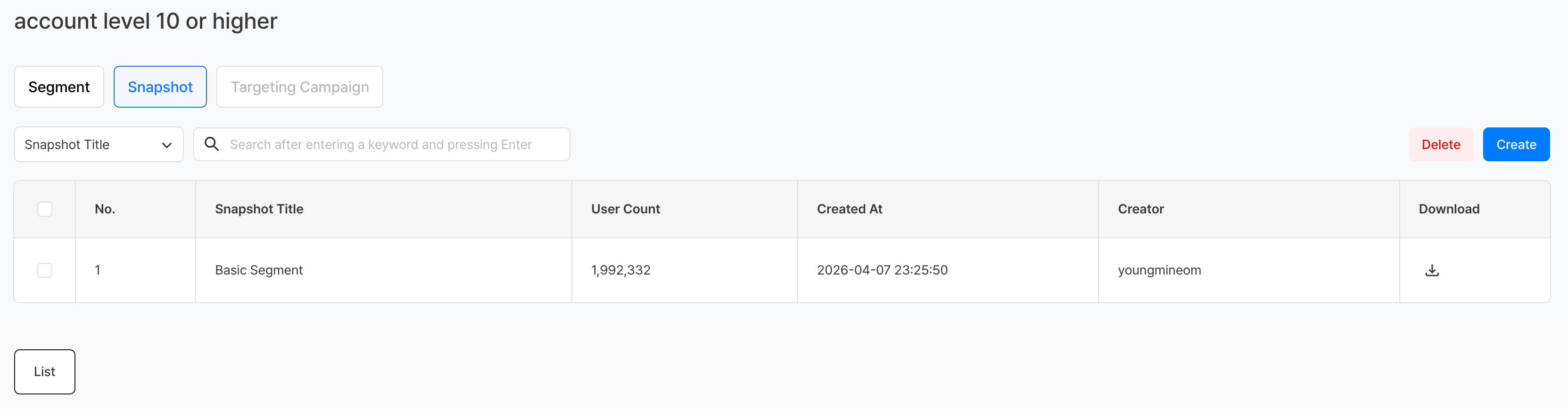 - 區隔快照是依區隔中設定的屬性條件抽取出的使用者清單。可透過區隔快照分頁確認已建立的區隔所抽出的使用者數。