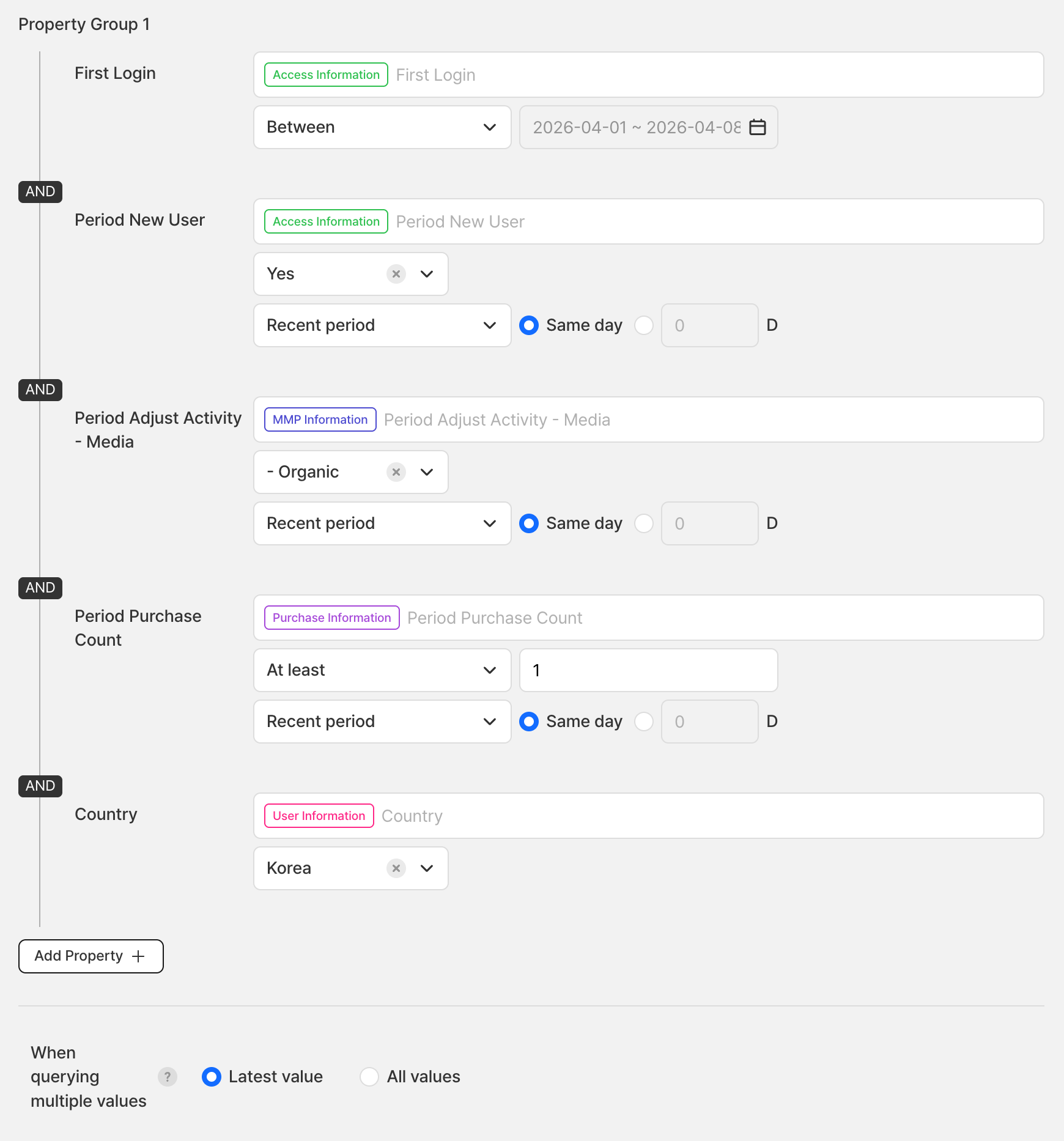 像國家、語言這類屬性名稱不是以「期間」開頭的屬性,會以使用者自首次登入後所有屬性值為基準提供。若查詢到多個值,可選擇下列其中一項設定條件。