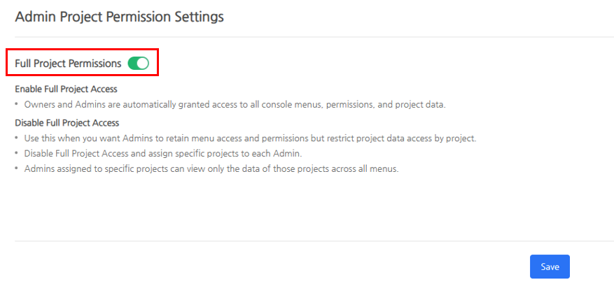 管理員擁有所有菜單的訪問權限和許可,但如果希望管理員根據公司的政策作為項目的個別經理進行操作,可以將「完整項目許可」的設置更改為關閉,並指定管理員負責的項目。