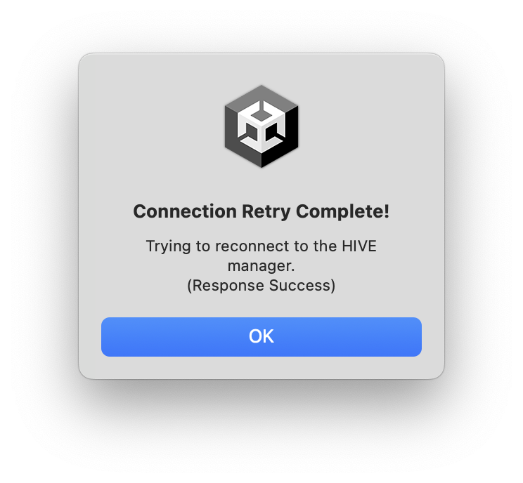 如果因為網路連接不良而禁用了 SDK 管理器菜單,請在 Unity 的頂部菜單中點擊 Hive > HIVE SDK Manager > Retry to connect HIVE Manager。這將嘗試重新連接到 Hive 管理器。如果成功連接到 Hive 管理器,管理器的內部信息將會更新為伺服器的刷新信息。