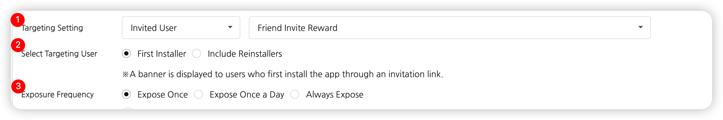 - 邀請用戶目標:對已收到好友邀請的用戶進行目標活動。您可以設置橫幅僅顯示給首次安裝應用的邀請用戶,並可以選擇橫幅曝光的頻率。