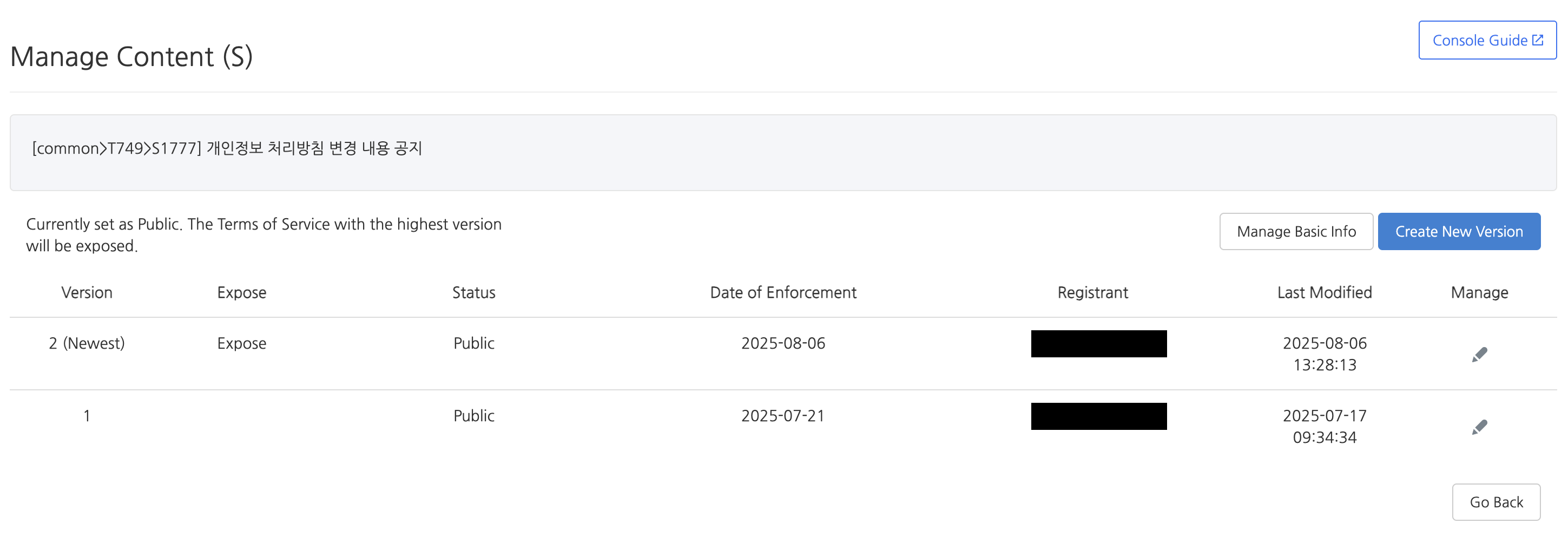 在 [条款内容注册 > 内容管理] 中,点击各版本右侧的管理按钮(铅笔)即可修改该版本。请在需要修改现有版本内容而不是创建新版本时使用。