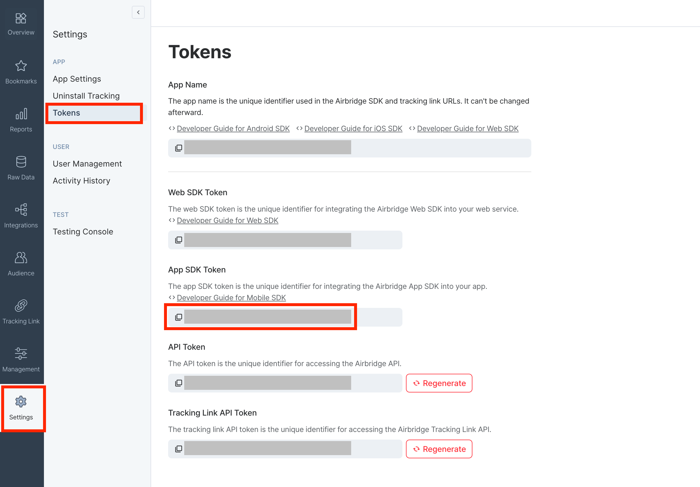 輸入從[b]Airbridge控制台/b發出的應用SDK令牌。