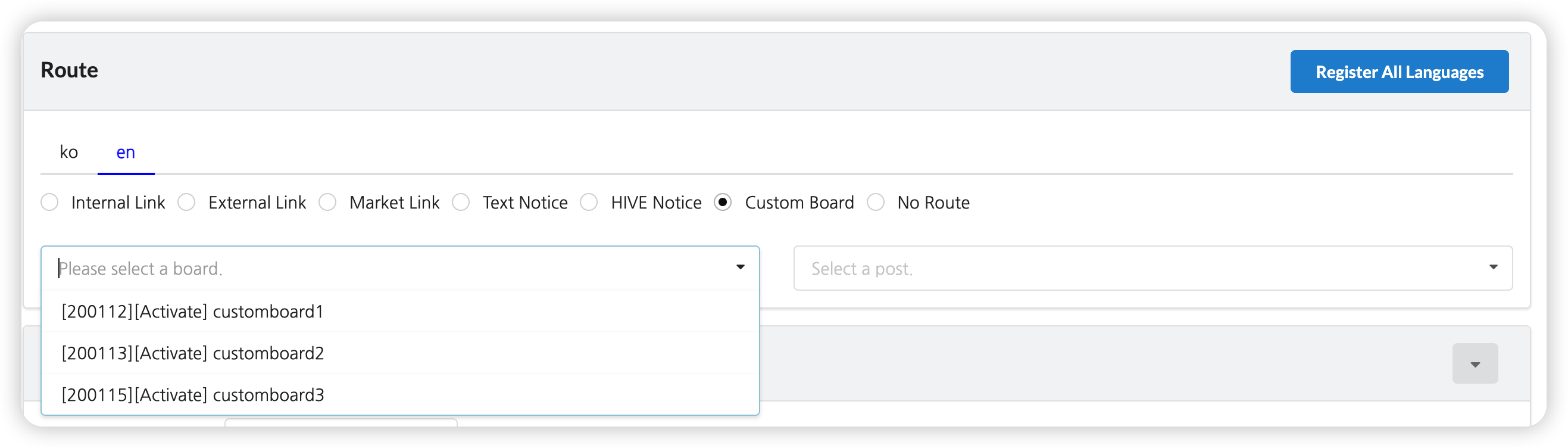 註冊到遊戲自訂板的帖子將顯示為項目,您可以將它們選擇為路徑。從第一個下拉選單中選擇一個板,然後從第二個下拉選單中選擇一個帖子。要鏈接到整個帖子列表而不是特定帖子,請選擇鏈接到自訂板帖子列表。