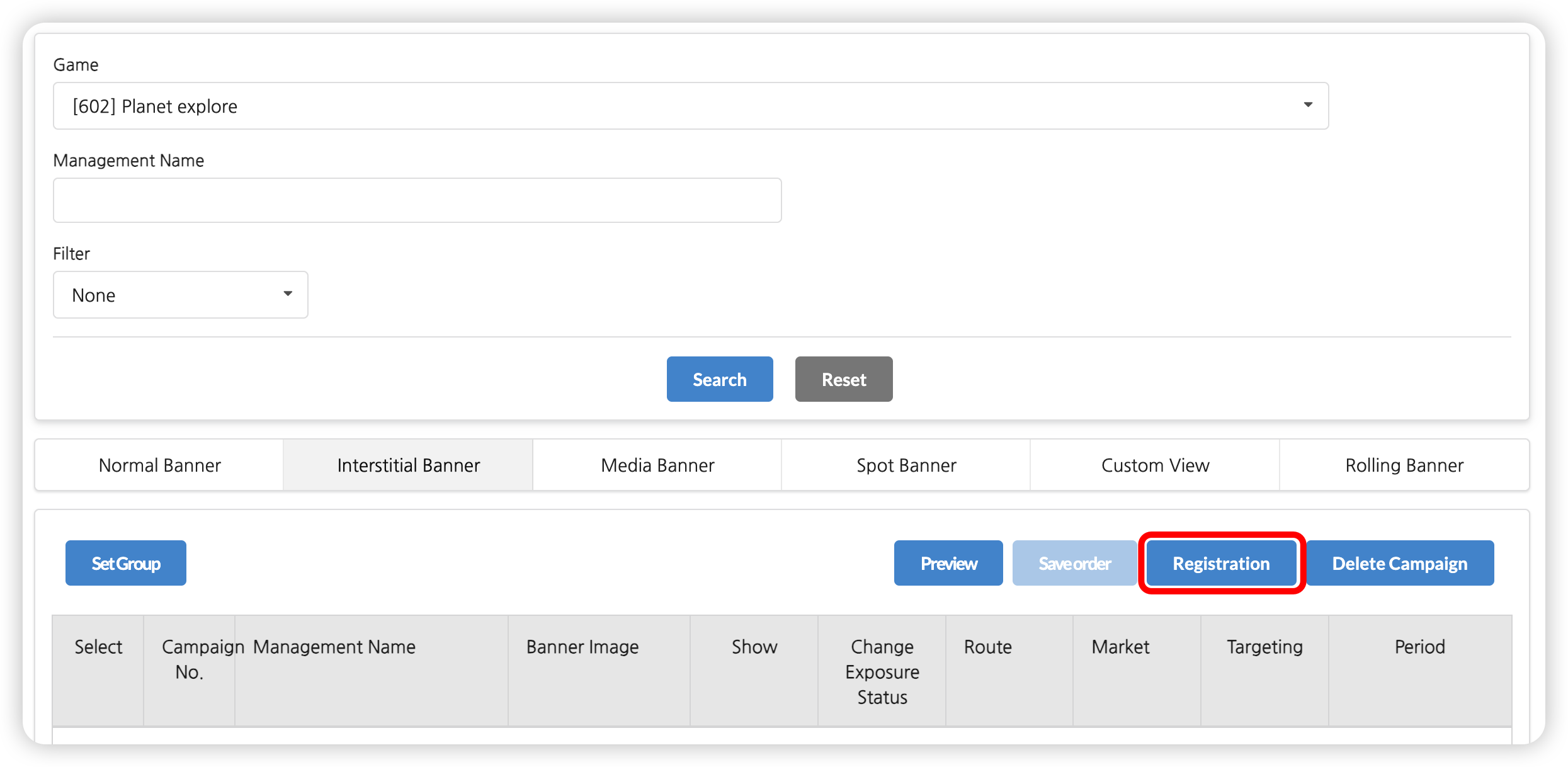 選擇一個遊戲並在普通/插頁式橫幅活動列表中點擊「預覽」。