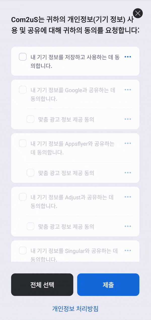 "main", * "google", "adjust", "appsflyer", "singular" "airbridge"之一。 - ConsentStatus.consentForDataUsage: 是否與
