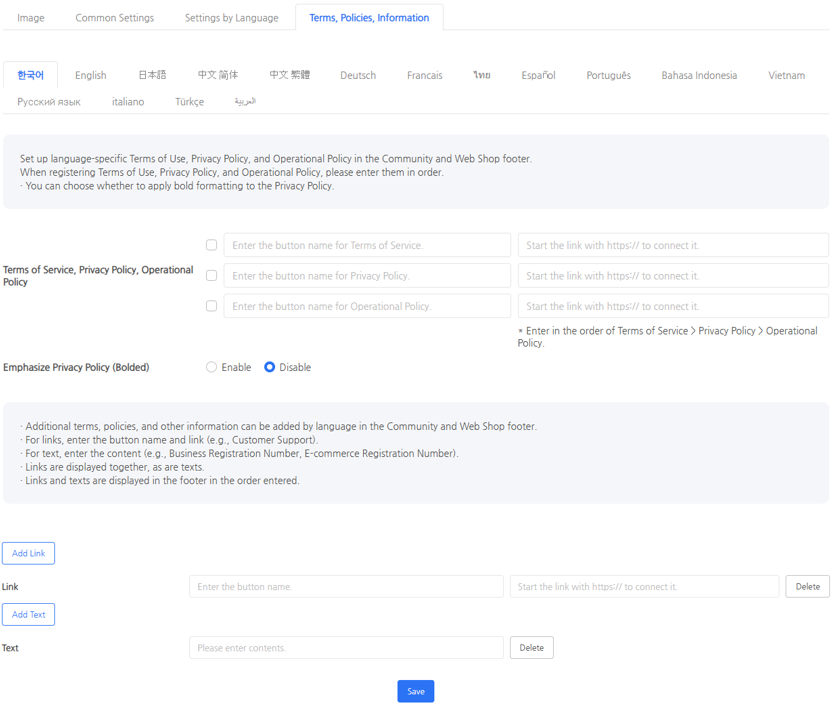 自由地將所需的文本信息添加到社區和網店的頁腳。