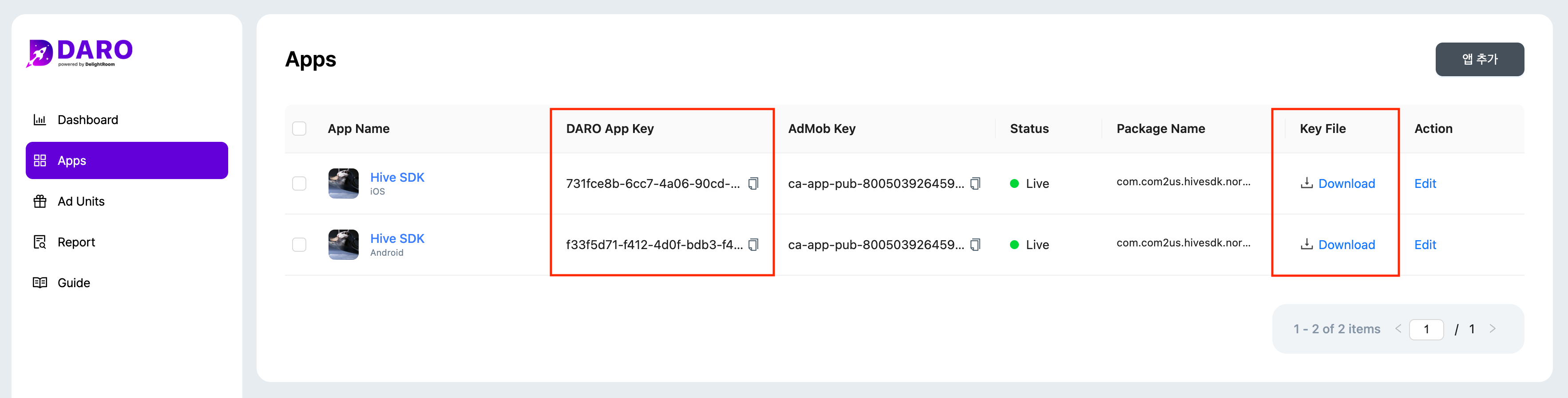 - daroAppKey 可以在 DARO 儀表板 - 應用程式 畫面上的「DARO 應用程式金鑰」中找到。