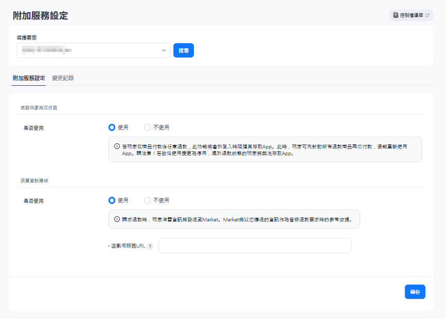 - 遊戲伺服器 URL:輸入遊戲伺服器 URL,可用於呼叫必要的資料以傳輸到 Market 以處理使用者退款請求。有關 API 的更多詳細信息,請參閱 API 指南。