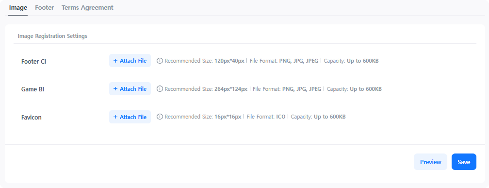 可設定欲顯示於網站頁尾中的各種元素。可加入遊戲下載連結、SNS頻道等,以使玩家快速前往遊戲相關的主要平台。