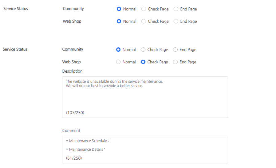 - 可依語言變更社群和網路商店網站的服務狀態。