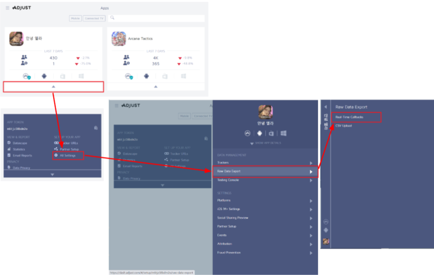 - 在選定的應用程式中,單擊 所有設定 > 原始數據導出 > 實時回調。