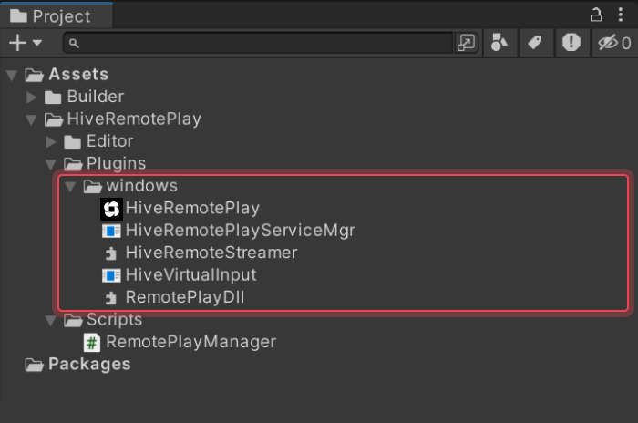 **套件**可以在**資產 > HiveRemotePlay > 插件 > Windows**中的專案項目下找到。