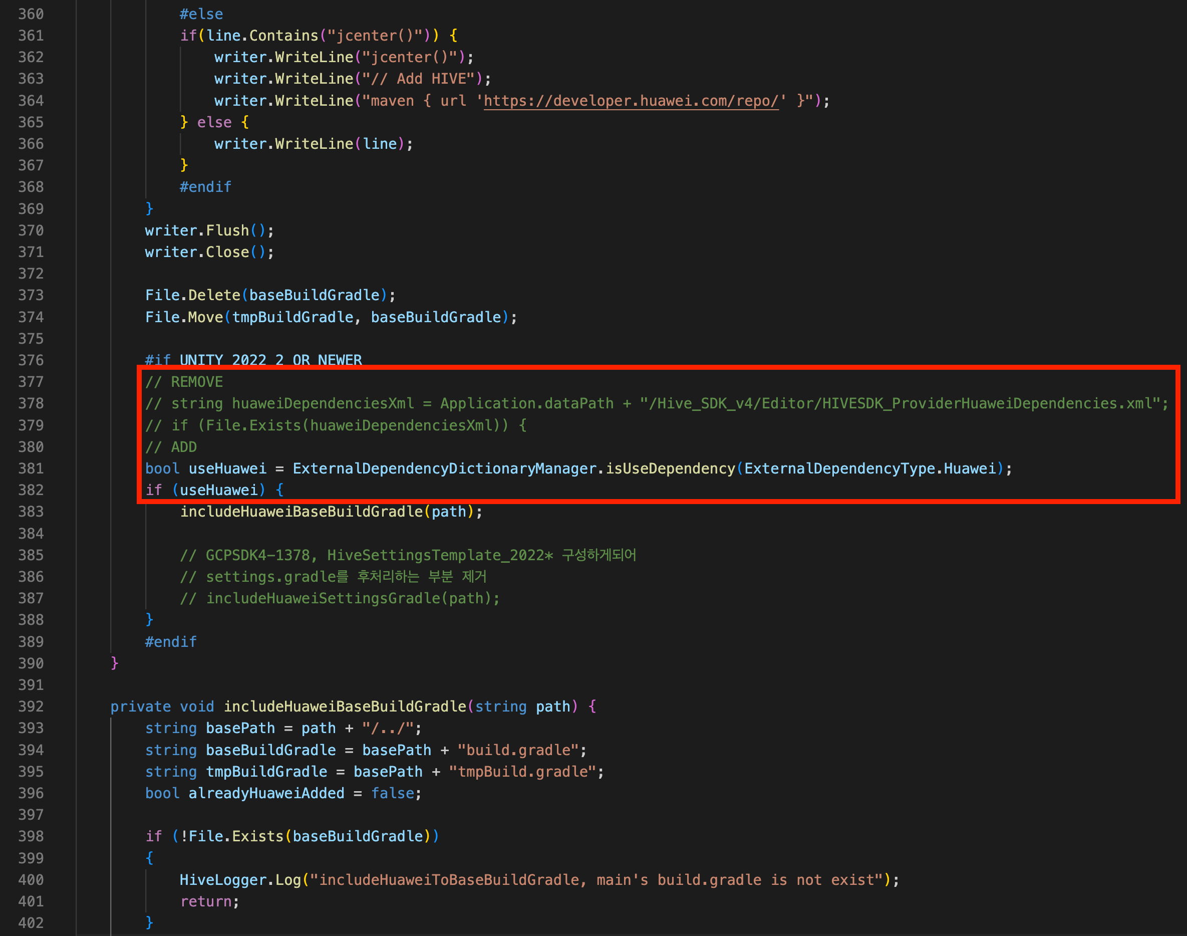修改 AndroidPostBuildProcessor.cs 在您的 Unity 项目中,前往 /Assets/Hive_SDK_v4/Editor/Android/AndroidPostBuildProcessor.cs,并进行以下更改以应用
