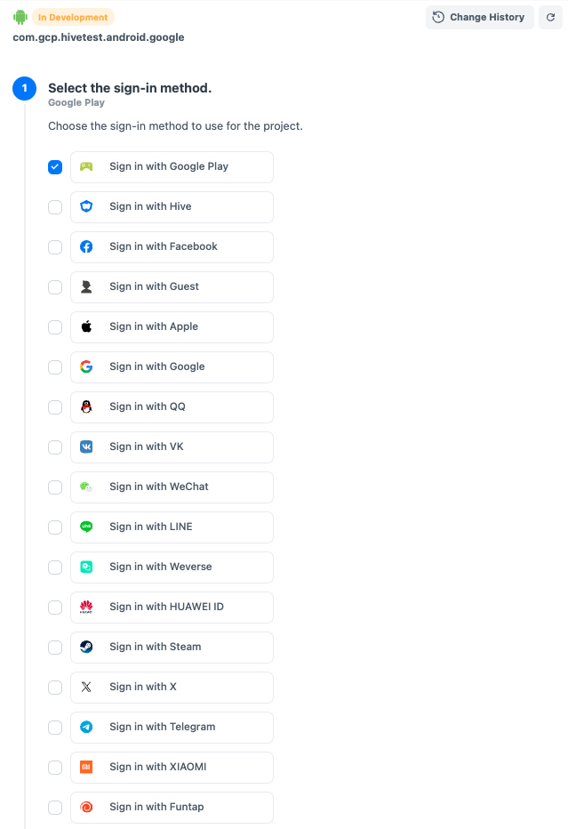 - 要使用 Google Play 進行登入,請在創建用戶憑證時生成 Android 和 Web 應用程序類型。Android 應用程序類型是 Hive SDK 配置所需的,而 Web 應用程序類型則用於在登入設置菜單中註冊身份驗證密鑰。