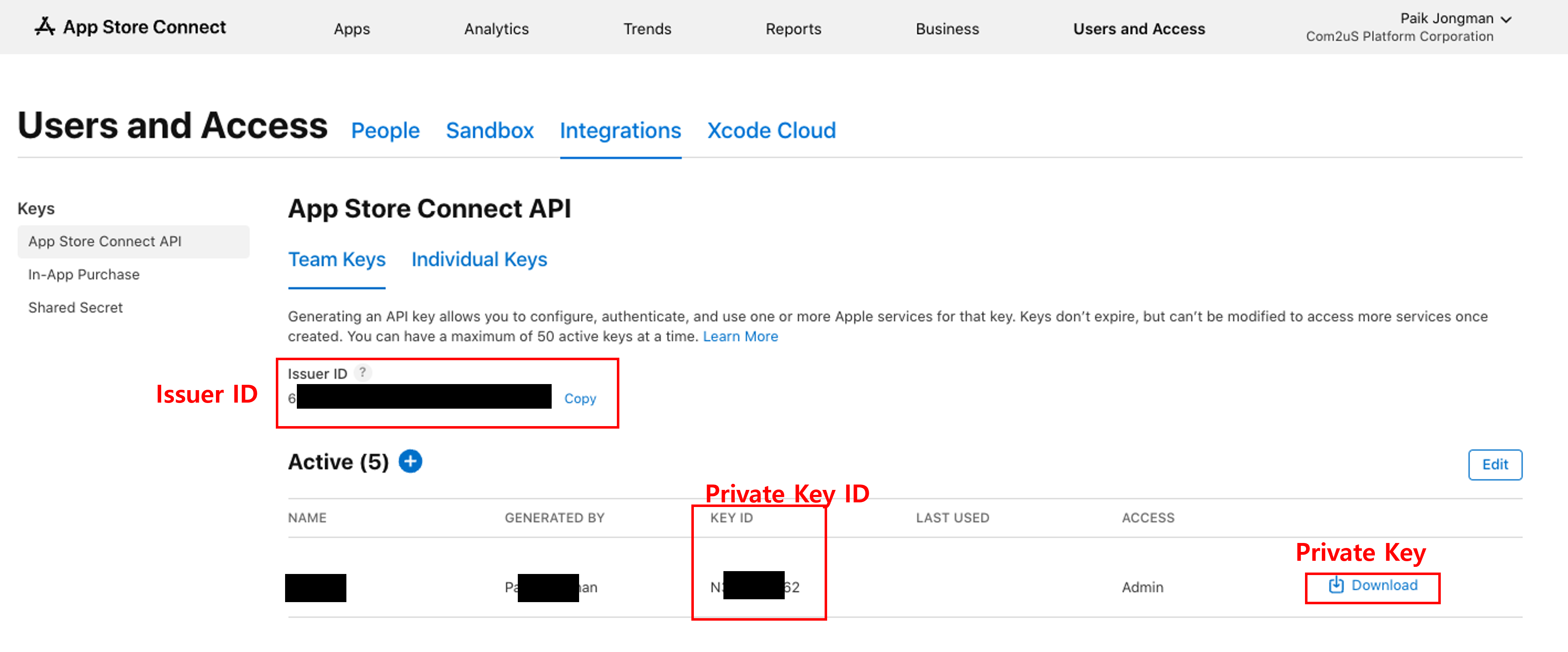 - Apple Market Console > 用户和访问 > 密钥 > App Store Connect API