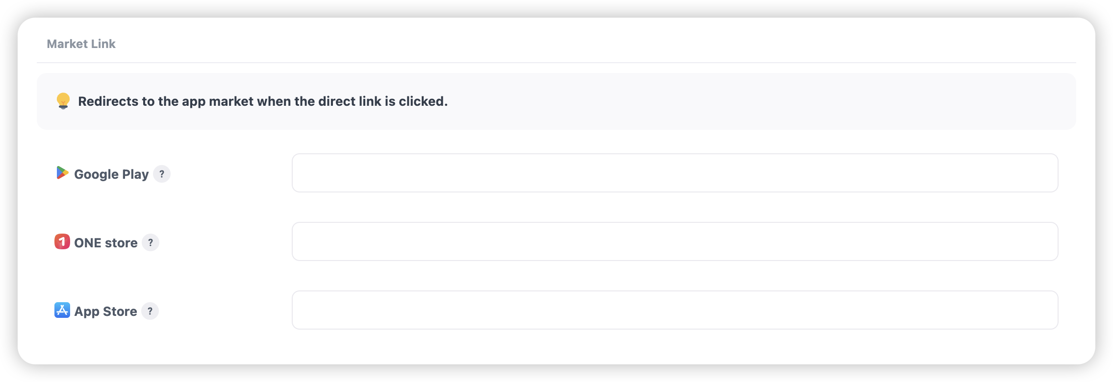 輸入Google Play、ONE Store和Apple App Store的市場網址。如果您在移動環境中選擇市場重定向作為直接鏈接的目的地,則用戶將被帶到此處設置的相應商店網址。