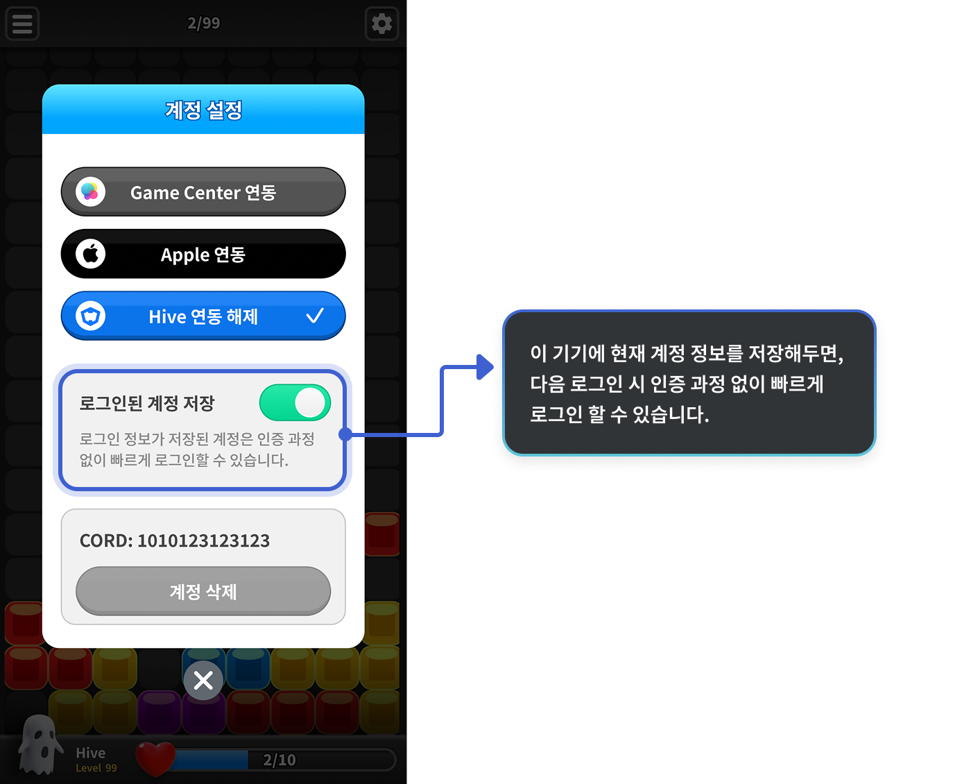 在显示的 PlayerID 列表 UI 中,用户可以选择删除保存的账户 (PlayerID),而不是登录。
