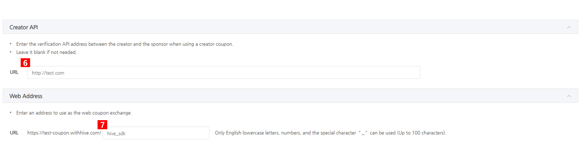 ⑥ 输入用于验证创作者与赞助者之间有效性的 API 地址。发放创作者的优惠券时必须输入。