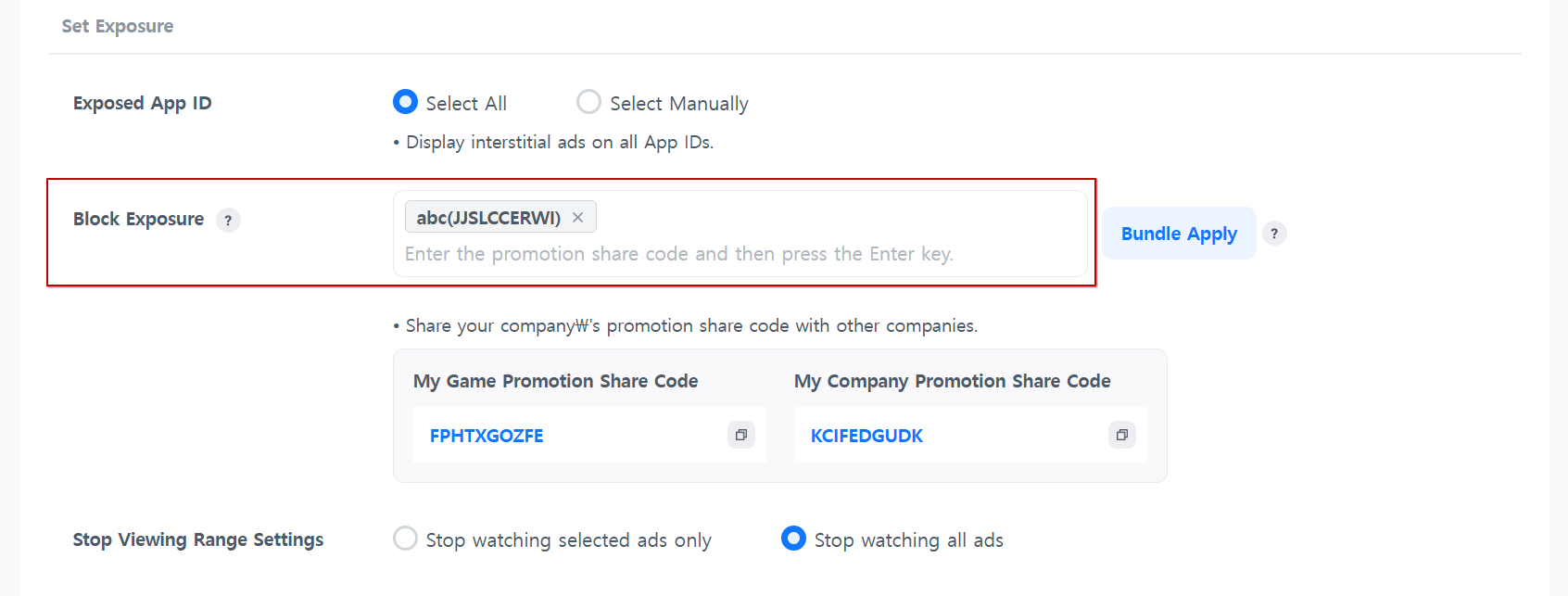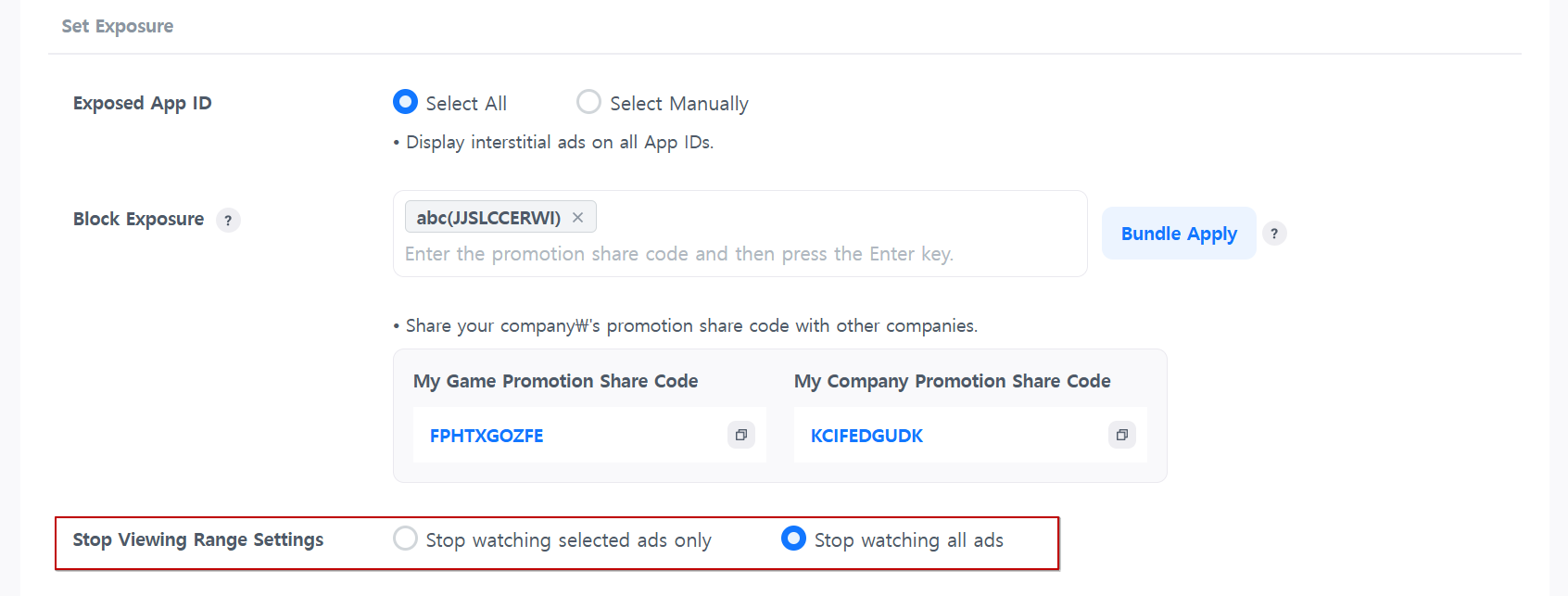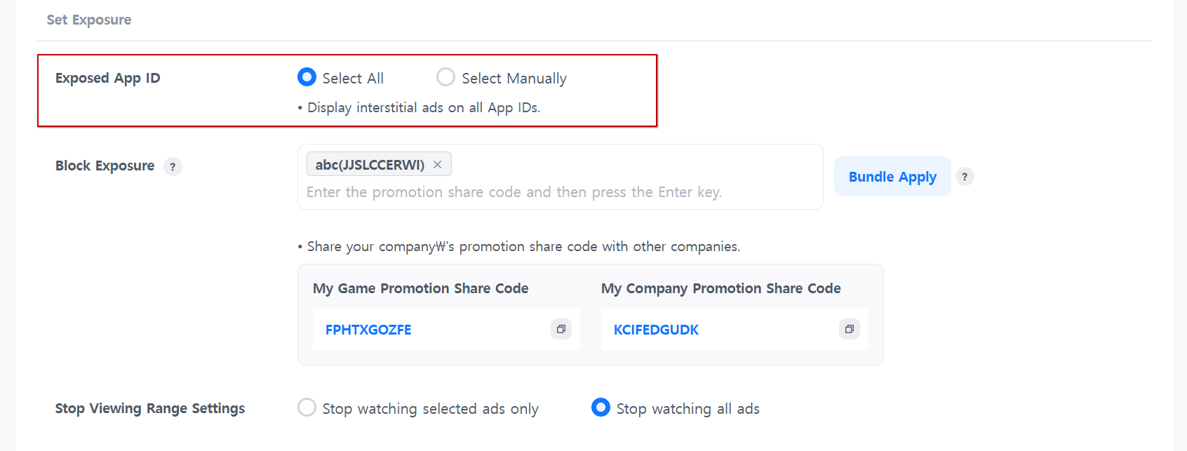 • 如果您选择全部,您可以在所有应用 ID 上暴露跨应用插页式广告。