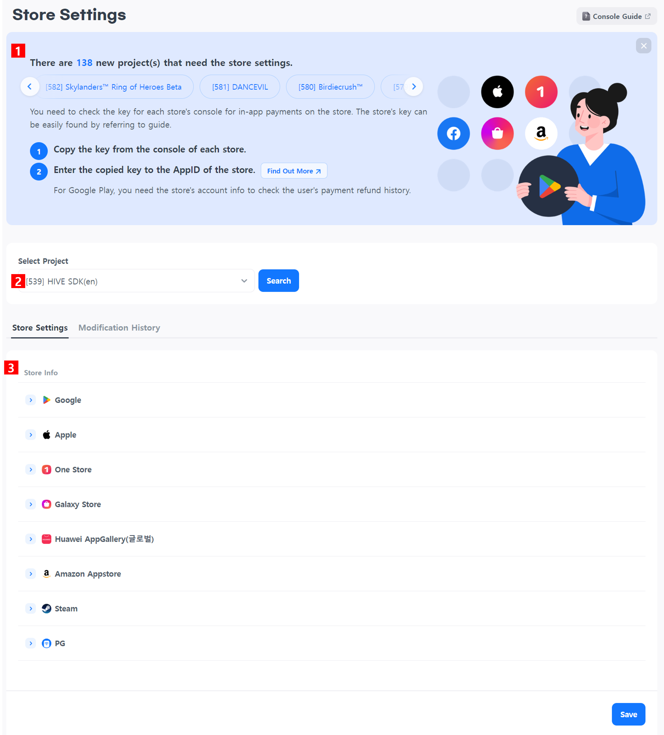 商店设置页面允许您注册与支付相关的许可密钥。在进行应用内或PG支付之前,您必须将每个商店的应用ID的密钥值输入到Hive控制台中。