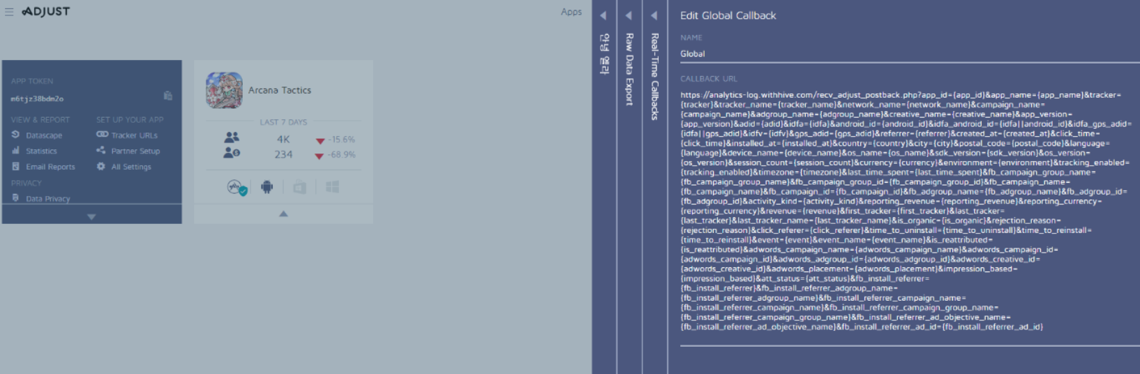https://analytics-log.withhive.com/recv_adjust_postback.php?app_id={app_id}&app_name={app_name}&tracker={tracker}&tracker_name={tracker_name}&network_name={network_name}&campaign_name={campaign_name}&adgroup_name={adgroup_name}&creative_name={creative_name}&app_version={app_version}&adid={adid}&idfa={idfa}&android_id={android_id}&idfa_android_id={idfa||android_id}&idfa_gps_adid={idfa||gps_adid}&idfv={idfv}&gps_adid={gps_adid}&referrer={referrer}&created_at={created_at}&click_time={click_time}&installed_at={installed_at}&country={country}&city={city}&postal_code={postal_code}&language={language}&device_name={device_name}&os_name={os_name}&sdk_version={sdk_version}&os_version={os_version}&session_count={session_count}¤cy={currency}&environment={environment}&tracking_enabled={tracking_enabled}&timezone={timezone}&last_time_spent={last_time_spent}&fb_campaign_group_name={fb_campaign_group_name}&fb_campaign_group_id={fb_campaign_group_id}&fb_campaign_name={fb_campaign_name}&fb_campaign_id={fb_campaign_id}&fb_adgroup_name={fb_adgroup_name}&fb_adgroup_id={fb_adgroup_id}&activity_kind={activity_kind}&reporting_revenue={reporting_revenue}&reporting_currency={reporting_currency}&revenue={revenue}&first_tracker={first_tracker}&last_tracker={last_tracker}&last_tracker_name={last_tracker_name}&is_organic={is_organic}&rejection_reason={rejection_reason}&click_referer={click_referer}&time_to_uninstall={time_to_uninstall}&time_to_reinstall={time_to_reinstall}&event={event}&event_name={event_name}&is_reattributed={is_reattributed}&adwords_campaign_name={adwords_campaign_name}&adwords_campaign_id={adwords_campaign_id}&adwords_adgroup_id={adwords_adgroup_id}&adwords_creative_id={adwords_creative_id}&adwords_placement={adwords_placement}&fb_install_referrer={fb_install_referrer}&fb_install_referrer_adgroup_name={fb_install_referrer_adgroup_name}&fb_install_referrer_campaign_name={fb_install_referrer_campaign_name}&fb_install_referrer_campaign_group_name={fb_install_referrer_campaign_group_name}&fb_install_referrer_ad_objective_name={fb_install_referrer_ad_objective_name}&fb_install_referrer_ad_id={fb_install_referrer_ad_id}