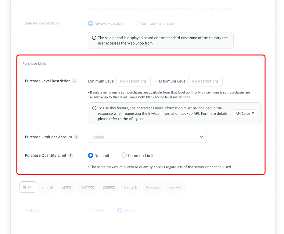 可通过设置各商品的购买条件来管理销售政策。 * 为使用购买等级限制功能,请在调用应用内信息查询API时,包含角色等级信息。查看详情 * 为确保购买限制功能(各账号购买限制与购买数量限制二者满足其一即可)正常运作,在输入用于接收付费结果的URL时,需增加数量验证功能。查看详情