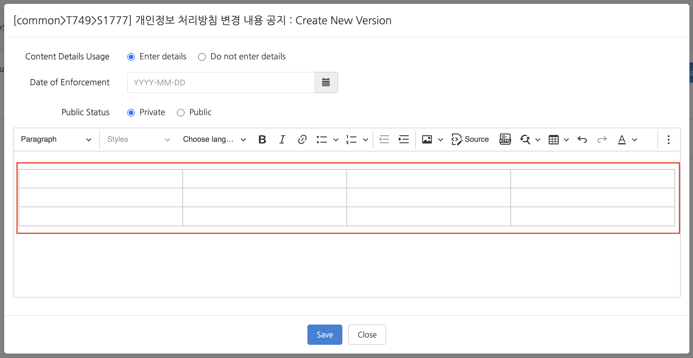 - 新版本的条款可以在弹出窗口中创建。如果在“内容文本输入与否”中选择“未输入”,则底部的文本编辑器不会显示。此功能用于注册没有内容的条款。默认设置为“输入”。