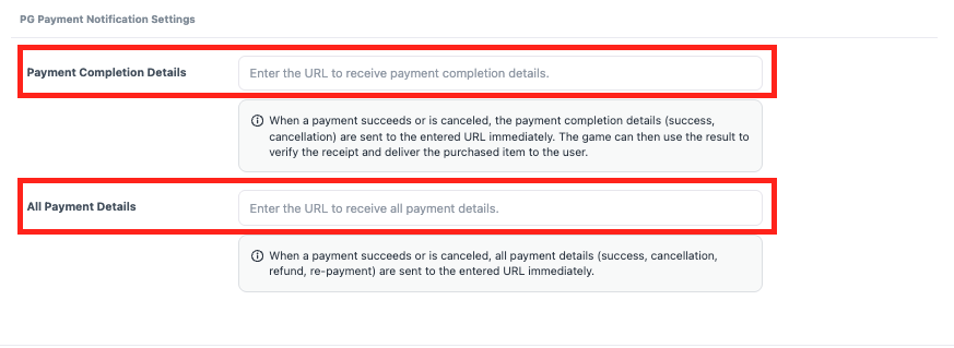 一旦支付成功或被取消,支付信息将发送到输入的 URL。游戏可以使用此结果来验证收据并将购买的物品交付给用户。如果没有配置的服务器,则此字段可以留空。在这种情况下,游戏必须直接查询未支付的交易并运行收据验证过程。