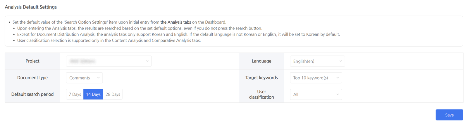 - 语言:选择默认的搜索语言。分析选项卡仅支持韩语和英语,除了“摘要”和“文档分析分布”。如果默认语言不是韩语或英语,分析选项卡默认使用韩语。