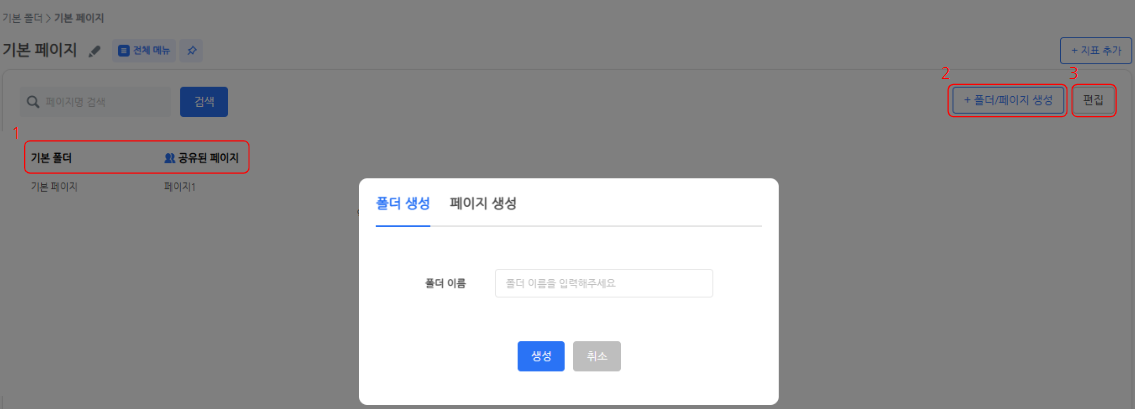 - 要创建一个用于放置仪表板的文件夹,请单击“创建文件夹/页面”按钮,然后转到“创建文件夹”选项卡,输入文件夹名称,然后单击“创建”按钮。