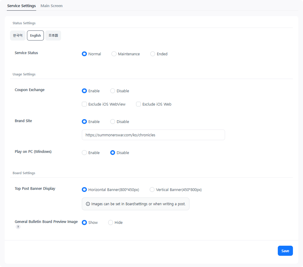 可以按语言来更改社区的服务状态。 - 描述和备注列中的文本可以自由修改。 - 检查页面和退出页面之间唯一的区别是主要文本,其他功能相同。 - 正常:更改为用户可以访问各网站的正常状态。 - 检查页面:将显示网站维护通知页面。此外,首次创建网站时也会设置为维护状态。 - 结束页面:显示为服务终止时可以使用的页面。