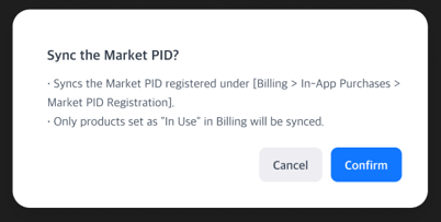 如果市场 PID 在 [账单 > 应用内支付 > 市场 PID 注册] 中注册,请点击确认。只有在账单中设置为“使用中”的市场 PID 会被同步。
