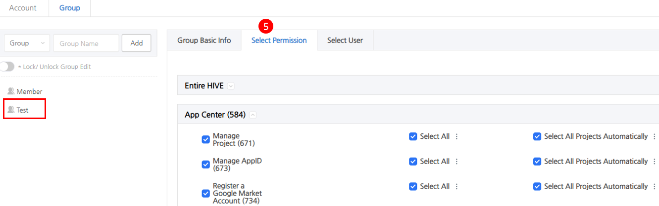 ⑧ 项目权限可以根据菜单授予。 从“自动选择所有项目”菜单右侧的Kebab菜单中选择要授予权限的项目。 如果您以相同的方式在其他菜单中设置项目权限,则可以根据菜单授予不同的项目权限。