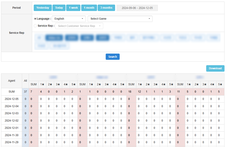控制台指南 > 顾客服务 > 服务评级 客户支持提供检查询价满意度的功能。用户可以评估他们对已完成查询的满意度。 服务评级仅支持游戏内客户服务。 搜索评分¶ 查看每个查询的座席满意度评级(星级和原因)。 Service Rep Rating 状态¶ 检查座席从用户评估中获得的满意度分数。 管理评级原因¶ 这是满意度调查的设置菜单。 如何设置服务评级¶ 选择是否启用满意度调查。 注册至少一个与 1 - 5 星评级对应的原因。