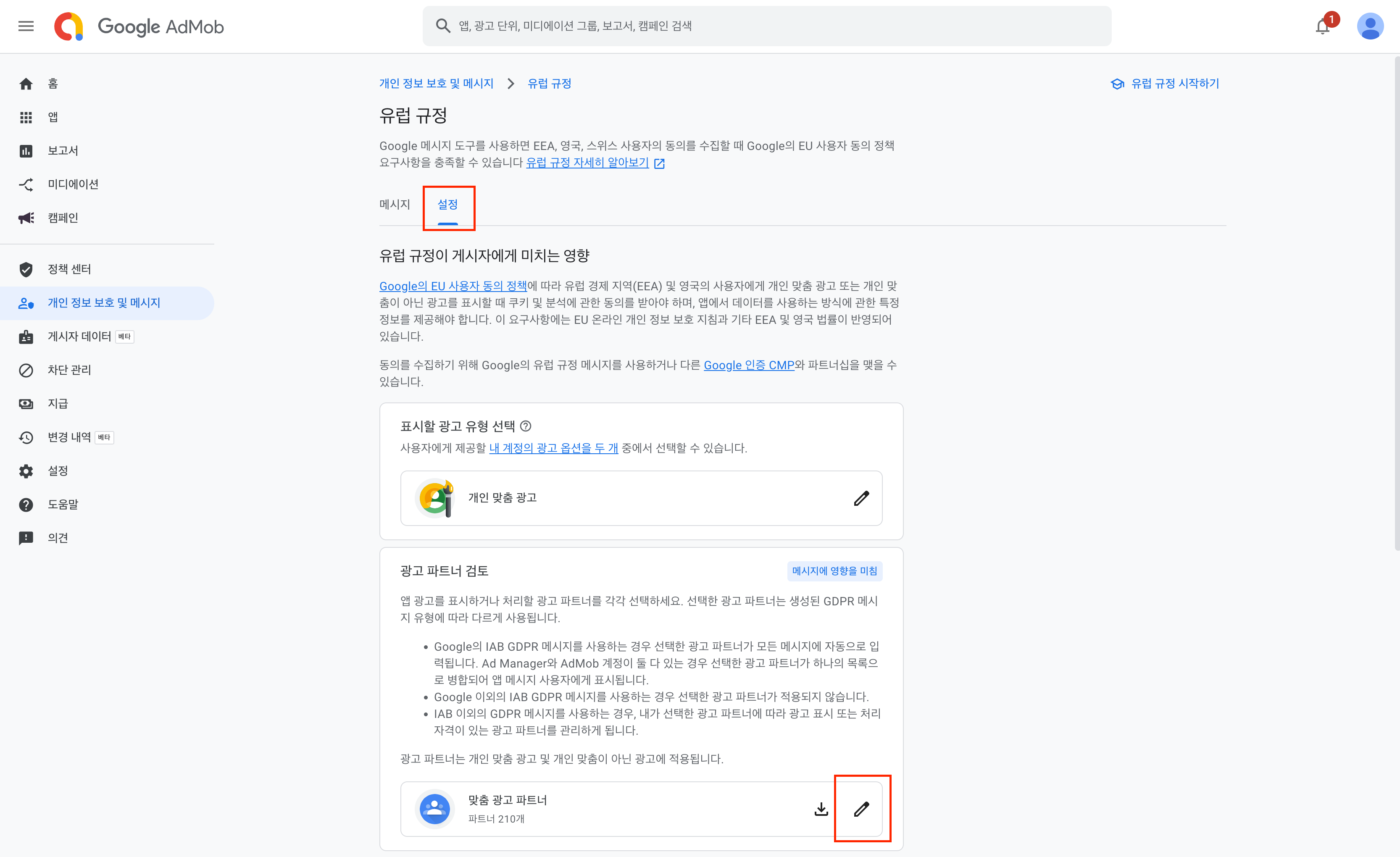 1) 在 Google AdMob 控制面板中,转到 隐私与消息 > 欧洲法规 > 设置 选项卡,然后点击 '广告合作伙伴审核 > 自定义广告合作伙伴' 的编辑图标。