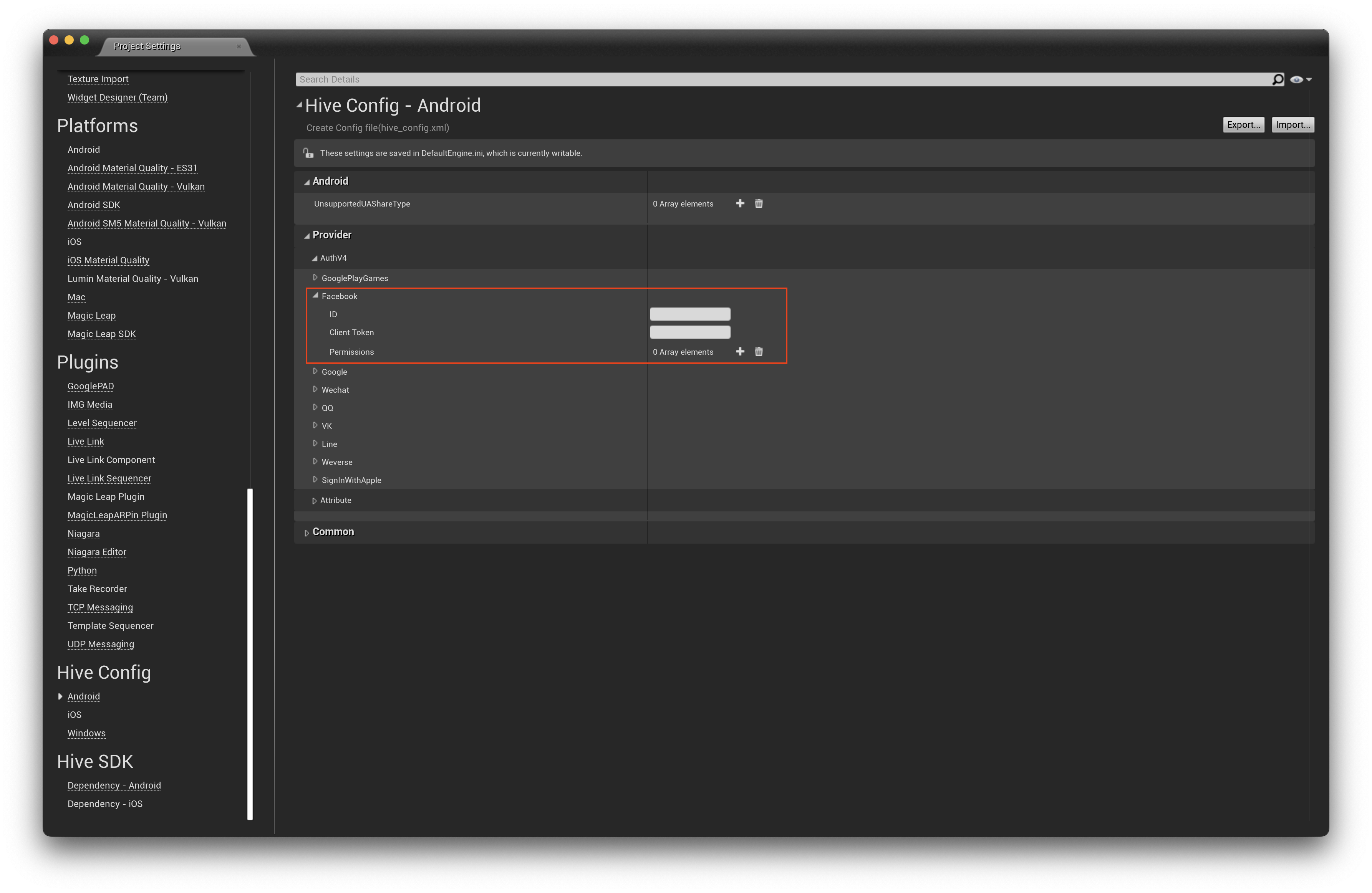 - 在 HIVEConfig XML 屏幕中,在 提供者 > AuthV4 > Facebook 字段中输入 Facebook 控制台信息。