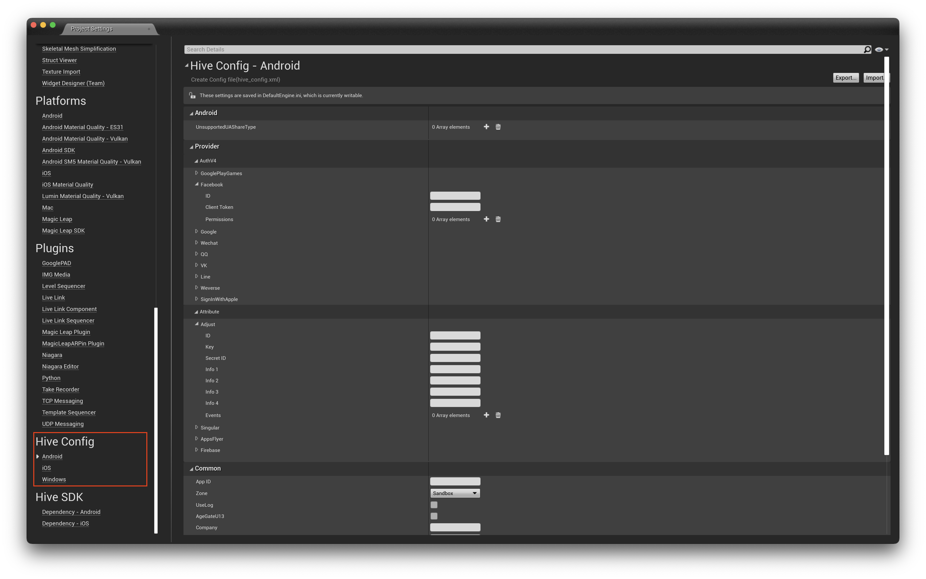 在虚幻环境中,您可以使用虚幻编辑器自动创建hive_config.xml文件并分配配置值。