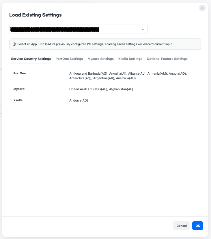 - 示例:如果PortOne服务国家设置为“韩国(KR)”,则Mycard或Xsolla也不能设置为“韩国(KR)”。