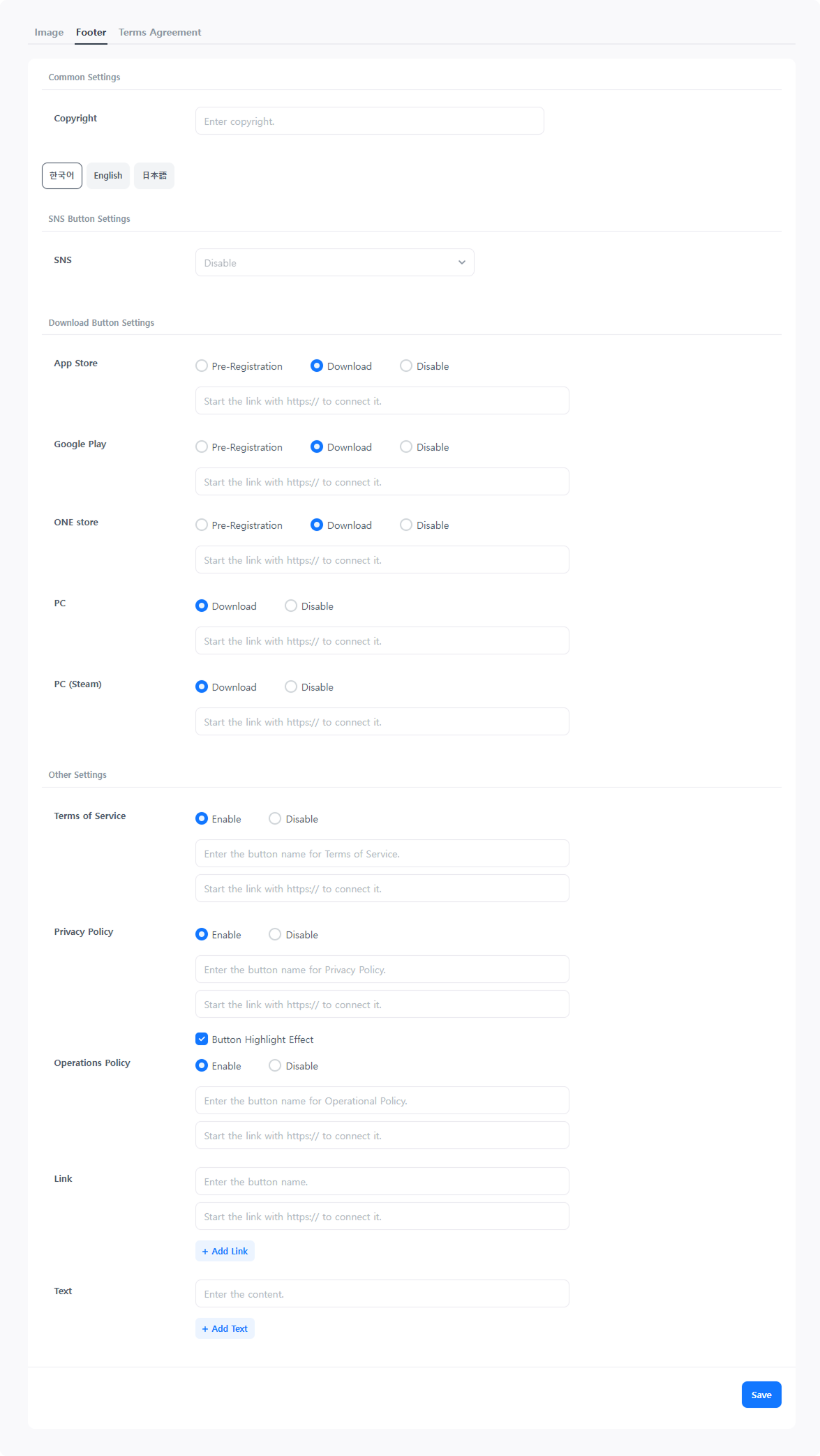 登记将在社区与网页商店中共同显示的项目或设置相关功能。 底部页脚显示的SNS图标及其他设置项可按网站语言分别登记