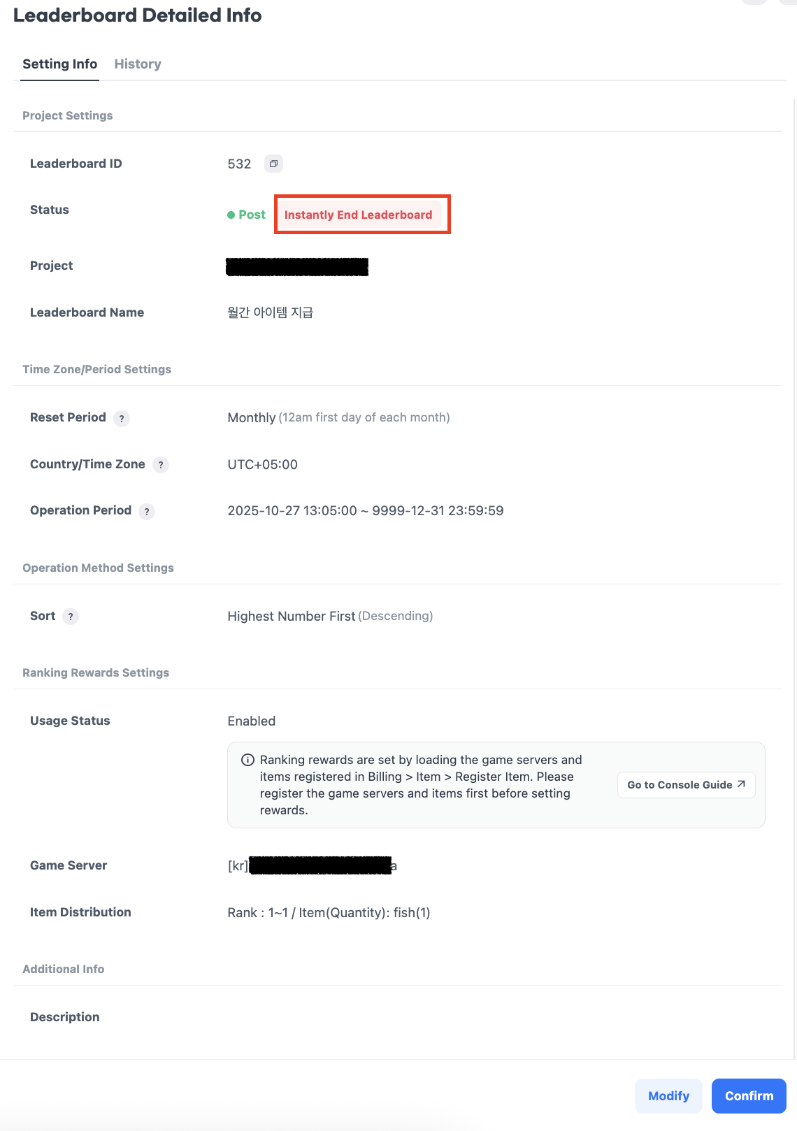 - 基于排名的奖励是通过游戏服务器和在计费 > 项目 > 项目注册中注册的物品进行配置的。在设置奖励之前,请注册游戏服务器和物品。