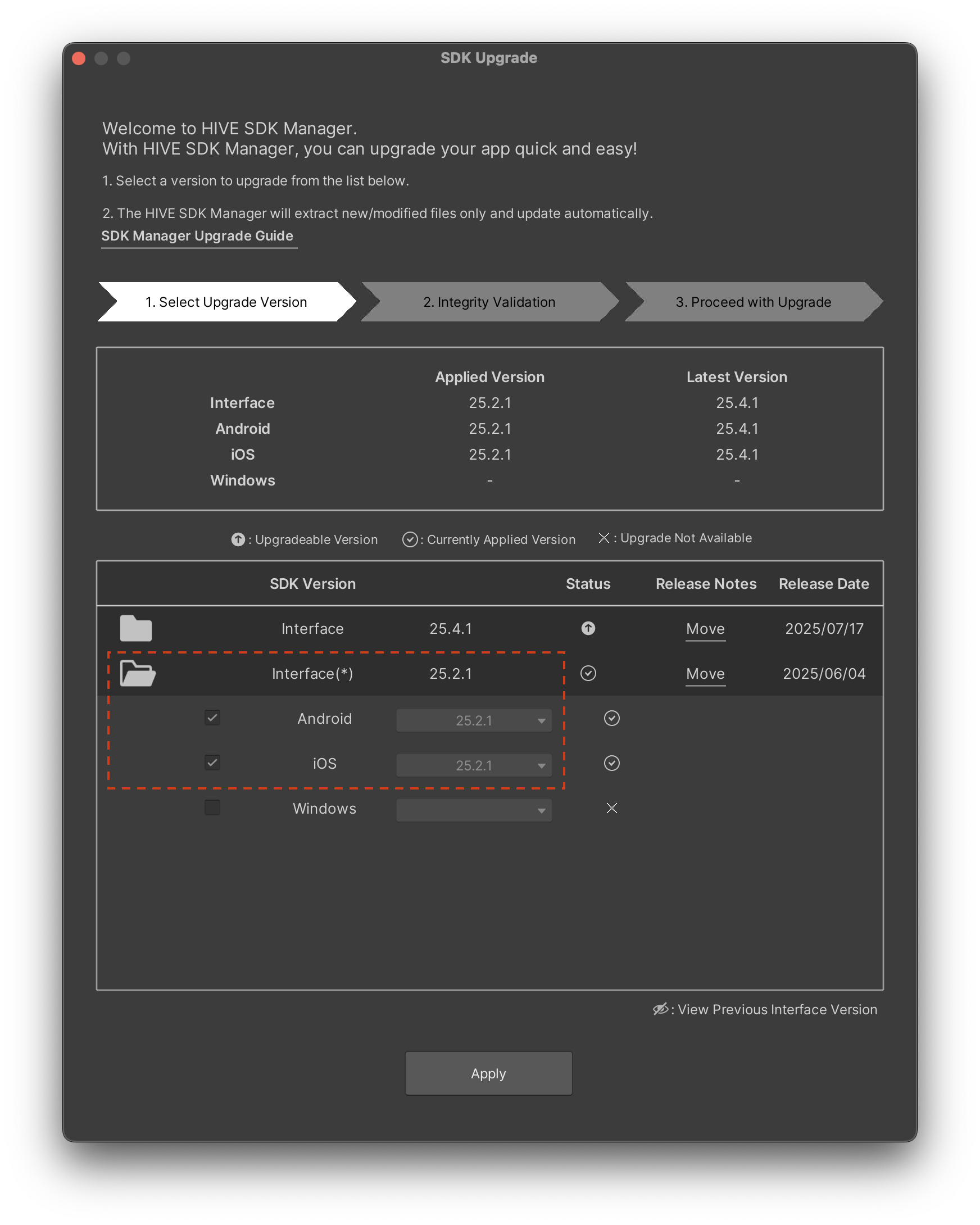 Hive SDK v4 Unity 25.4.0 以下版本未以 Interface 及 Platform 包的形式分离。若要通过 Hive SDK 新安装 Hive SDK v4 Unity 25.4.0 以下版本或更新为 25.4.0 以下版本,请遵循以下内容。